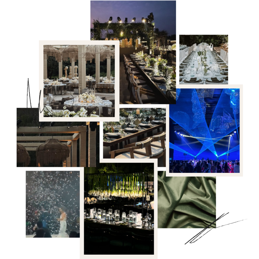El concepto visual que les compartimos en este moodboard refleja la atmósfera cálida, elegante y contemporánea que buscamos lograr. Cada luz y cada detalle de sonido están pensados para acompañar cada momento del evento, desde la cena íntima hasta el clímax en la pista de baile.